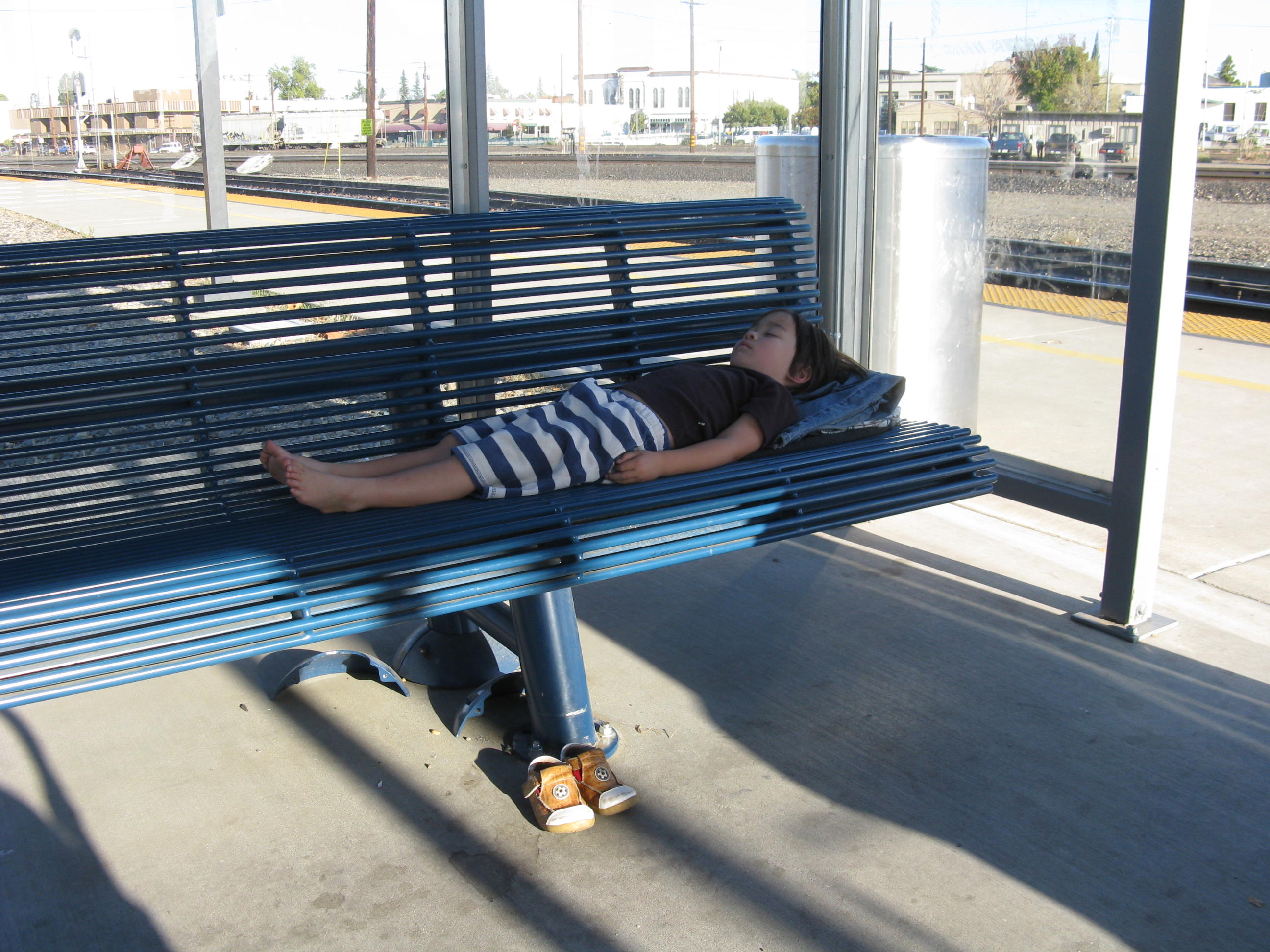 Teo took a nap at the train station while waiting for a train that was involved in an accident; we finally gave up, took a bus to Sacramento to take an alternative train back home. All part of the adventure.